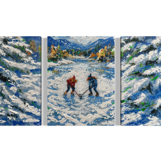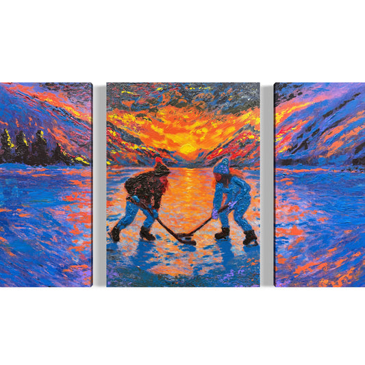 Pond Hockey at Sunset ORIGINAL Hand-Painted Acrylic Art on Canvas (All Three Pieces)